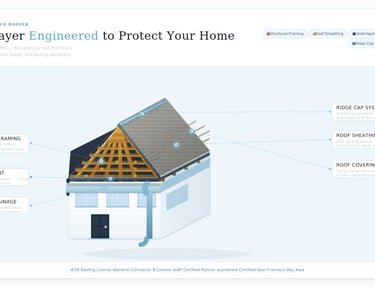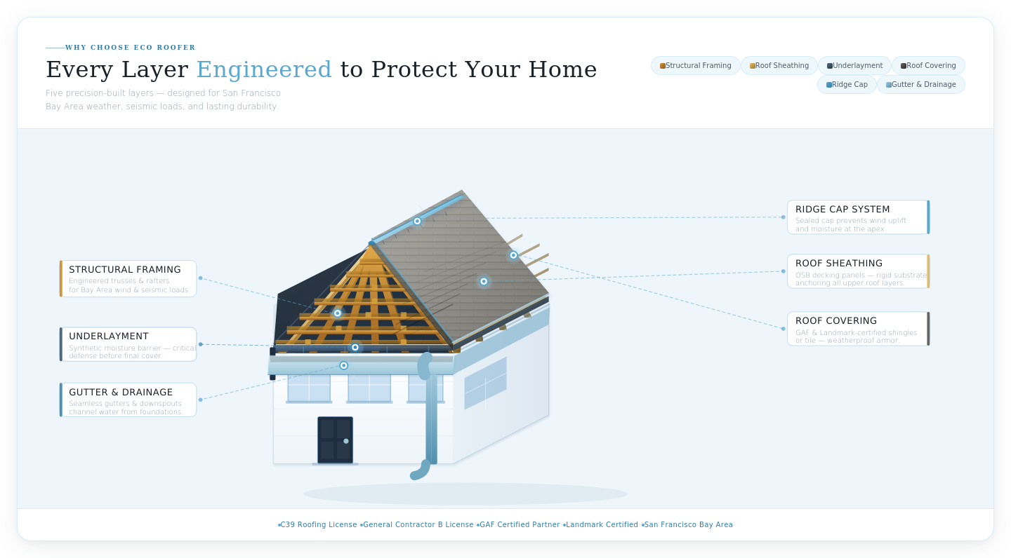 At Eco Roofer, we believe your home deserves more than a quick fix. As a San Francisco-based roofing contractor, we specialize in high-quality roof installations, complex repairs, and thorough roof inspections — built to handle the Bay Area's unique climate and architectural demands.